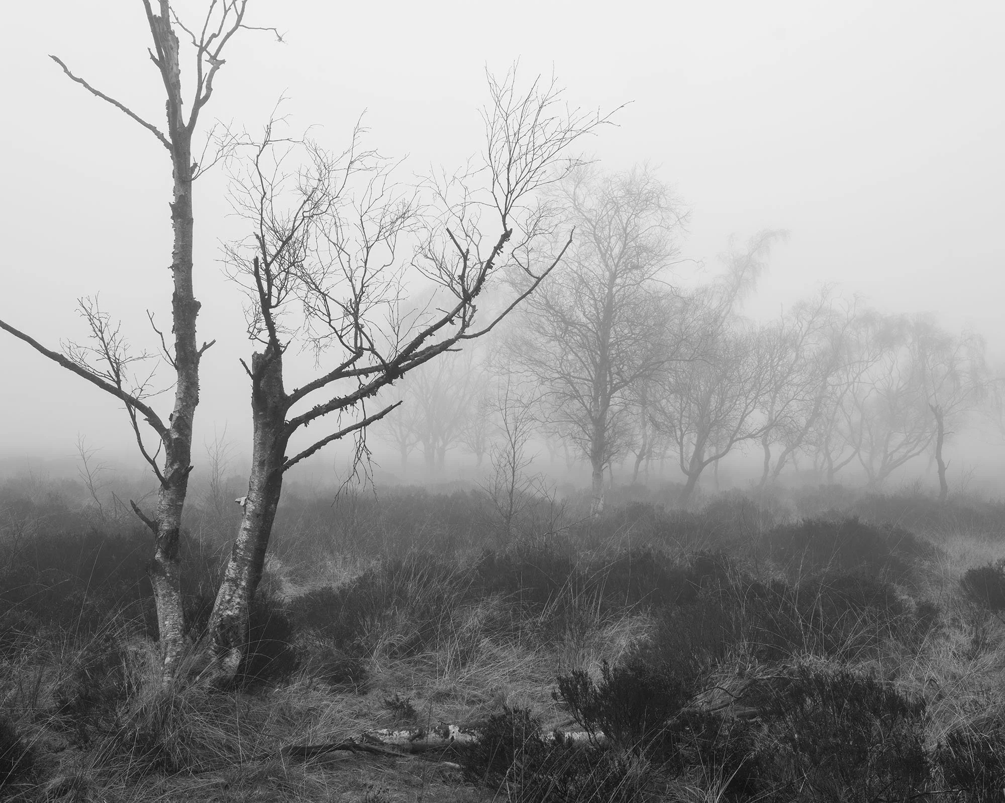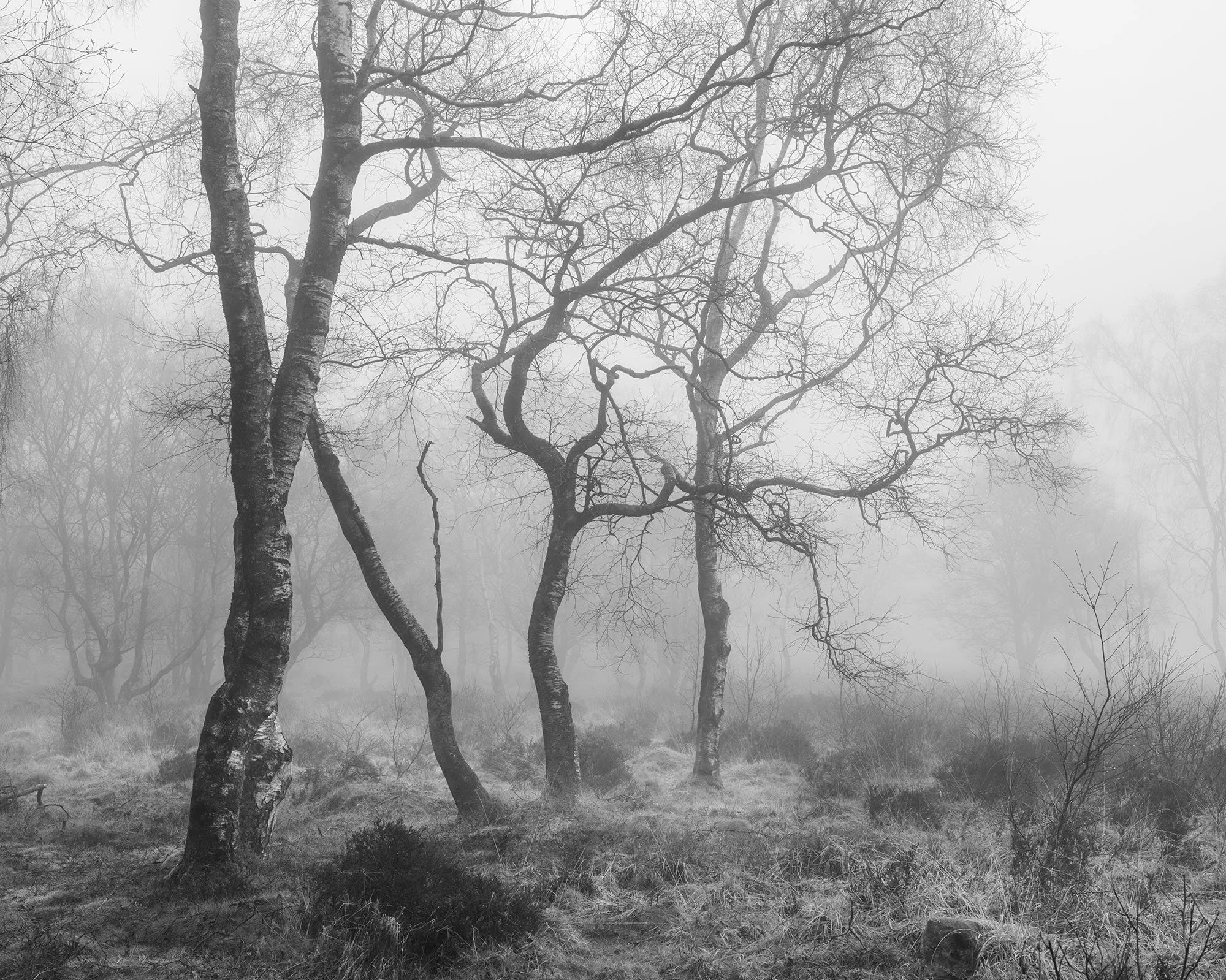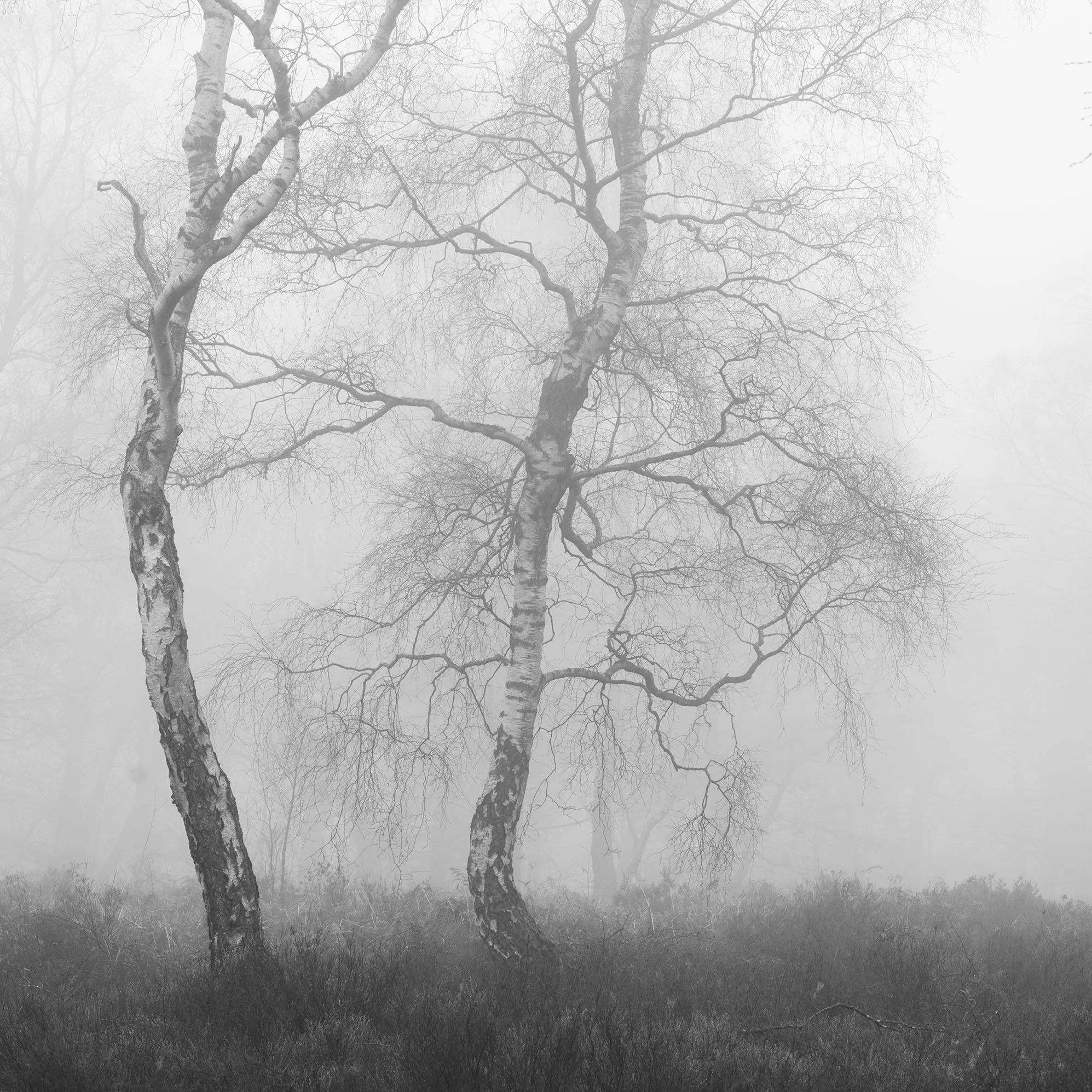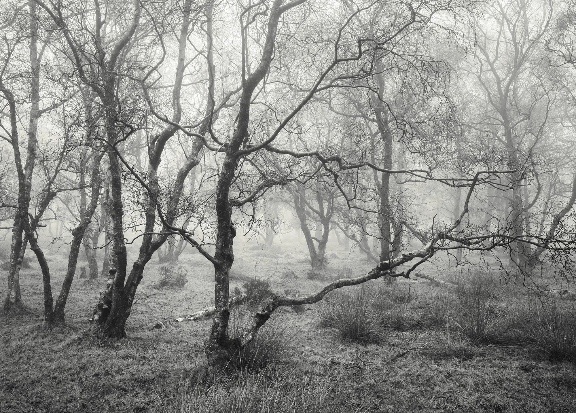 Bare Silence explores winter woods, where the absence of foliage allows the character of each tree to emerge. Gnarled trunks lean and turn, branches fork and curl, and the intricate architecture of the woodland becomes visible. What might seem bleak at first glance holds a subtle beauty, a study in line, shape and stillness.