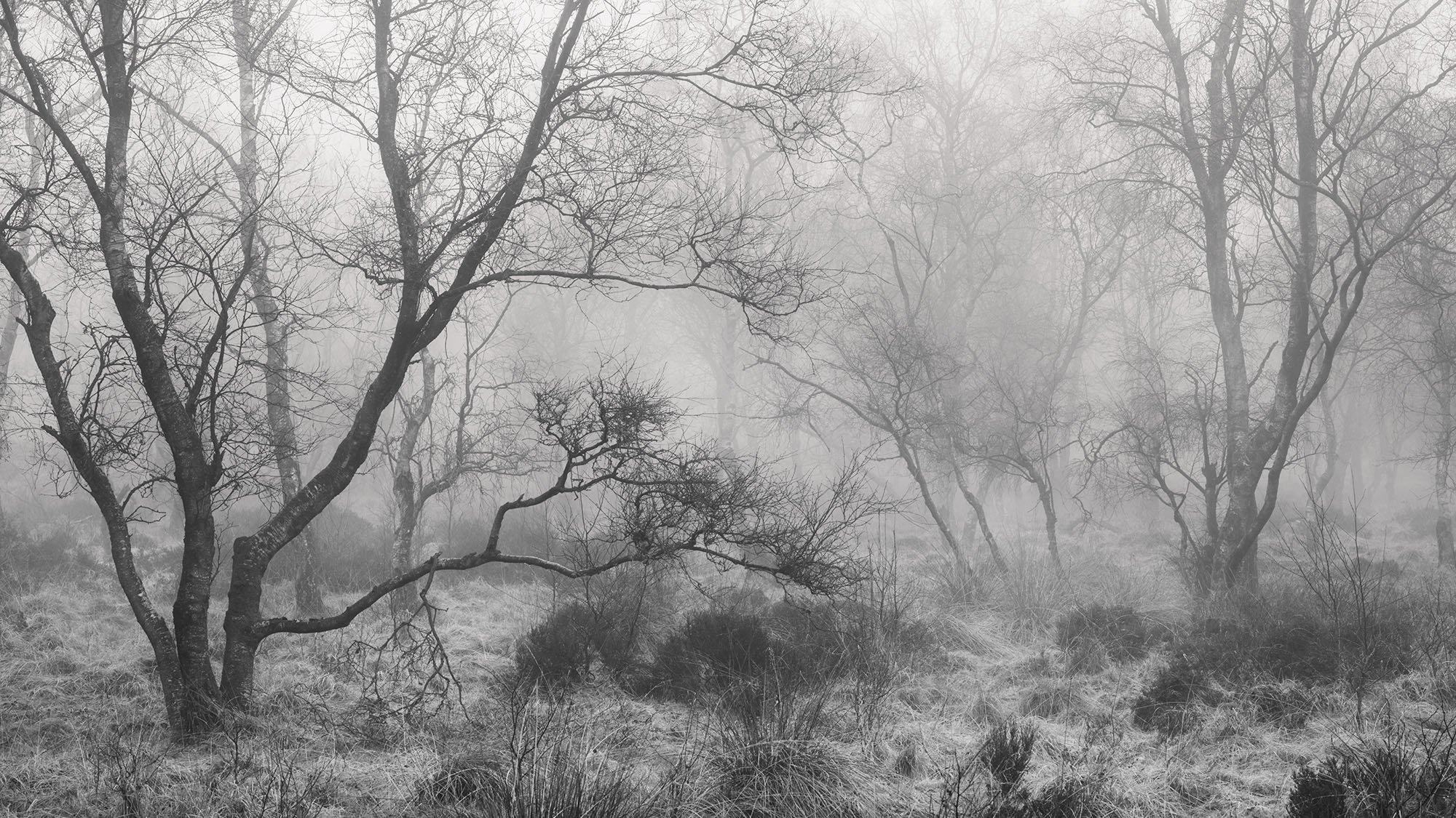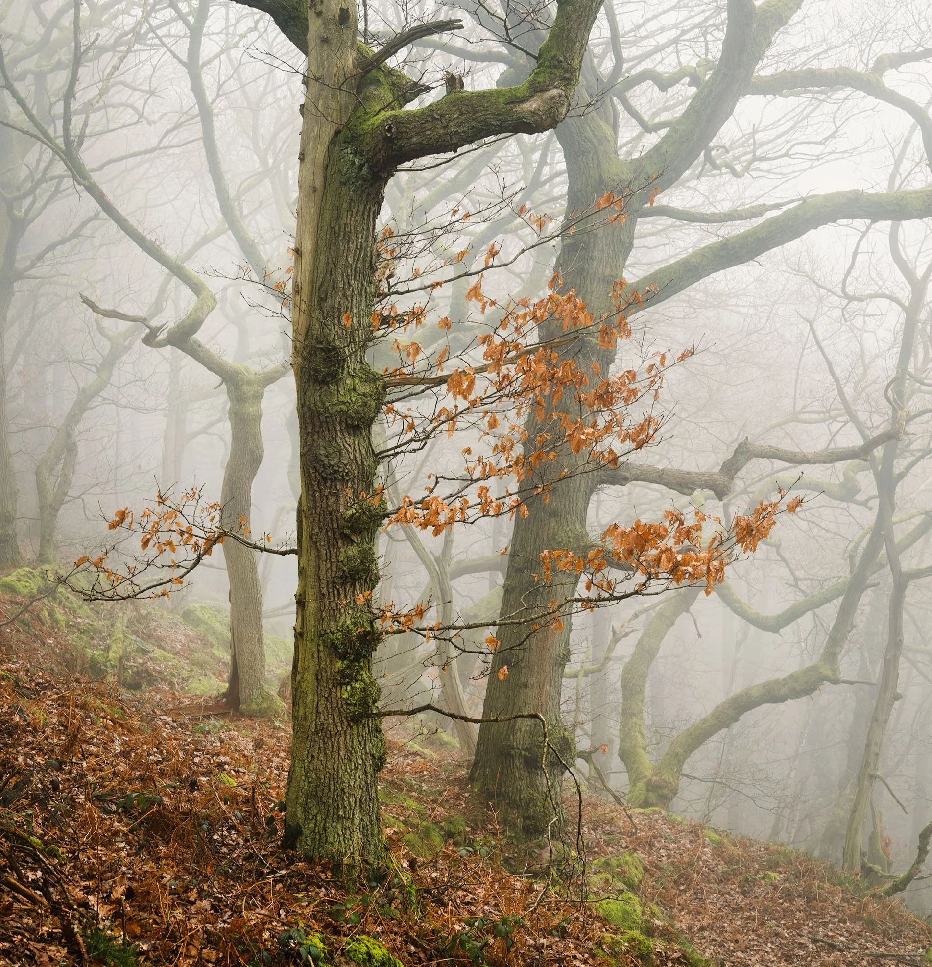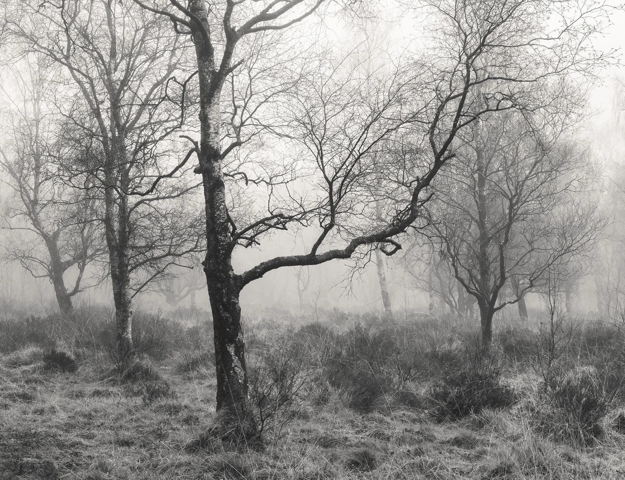 Bare Silence explores winter woods, where the absence of foliage allows the character of each tree to emerge. Gnarled trunks lean and turn, branches fork and curl, and the intricate architecture of the woodland becomes visible. What might seem bleak at first glance holds a subtle beauty, a study in line, shape and stillness.