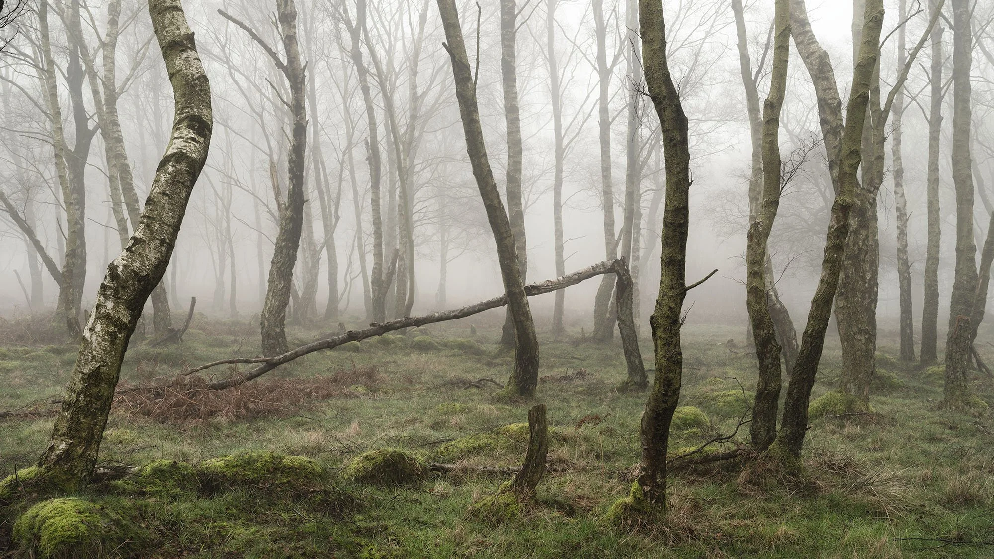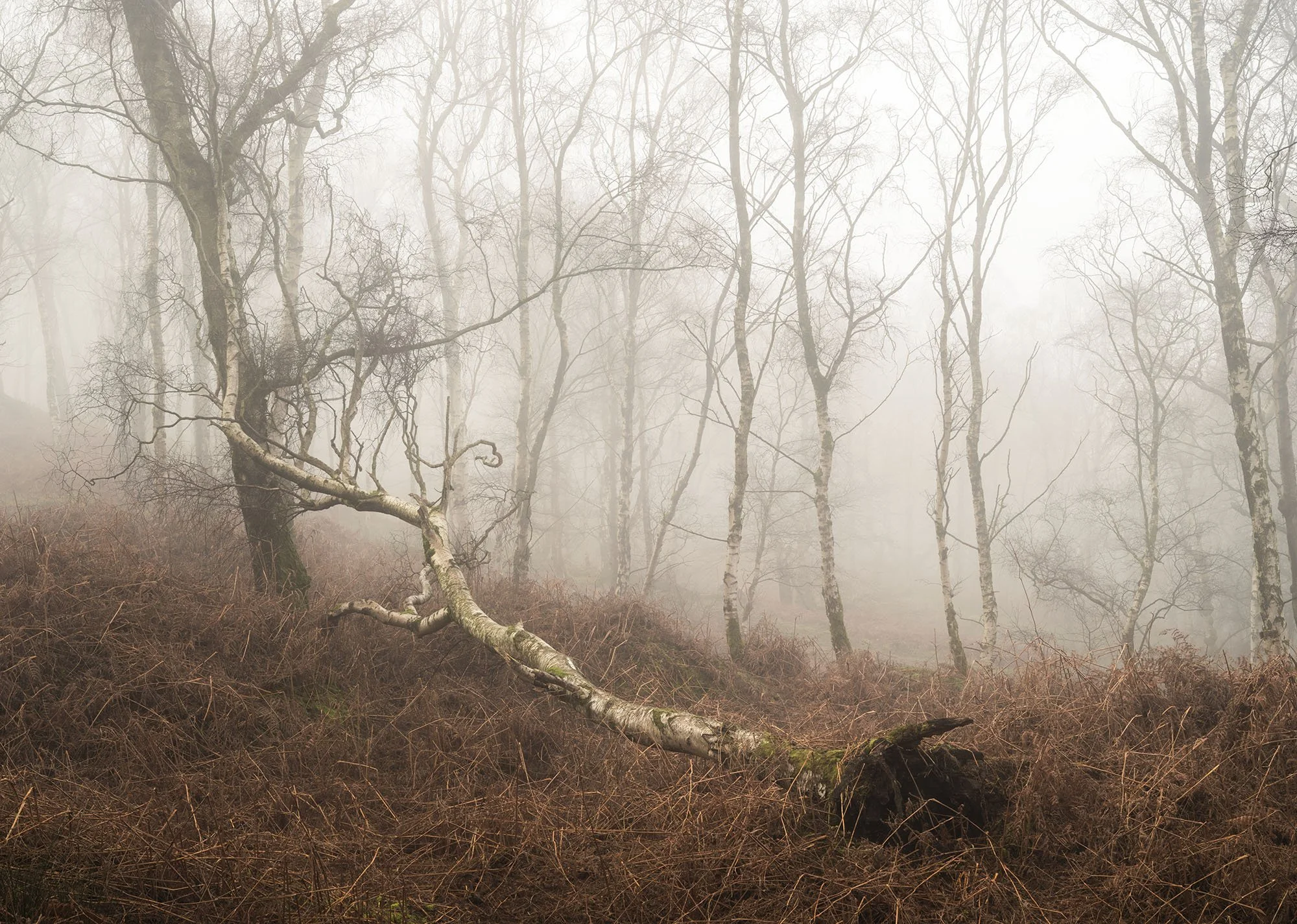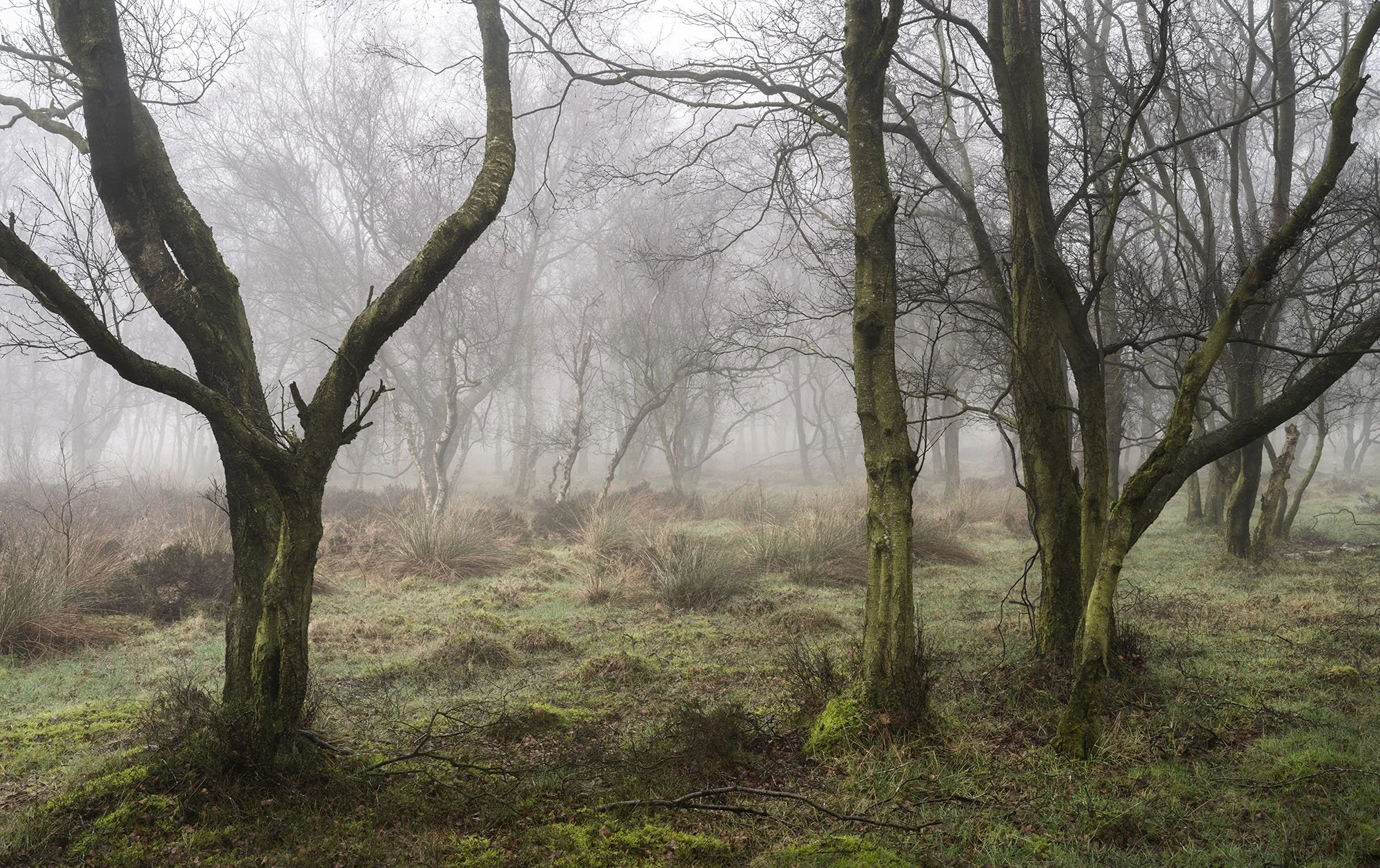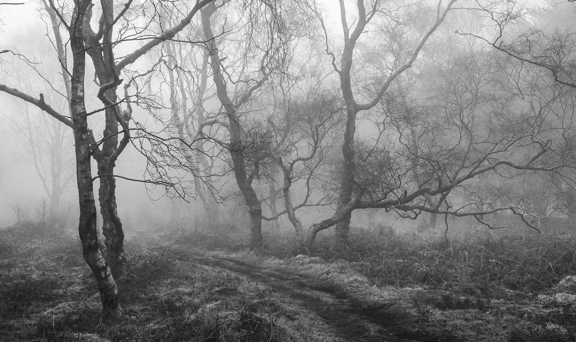 Bare Silence explores winter woods, where the absence of foliage allows the character of each tree to emerge. Gnarled trunks lean and turn, branches fork and curl, and the intricate architecture of the woodland becomes visible. What might seem bleak at first glance holds a subtle beauty, a study in line, shape and stillness.