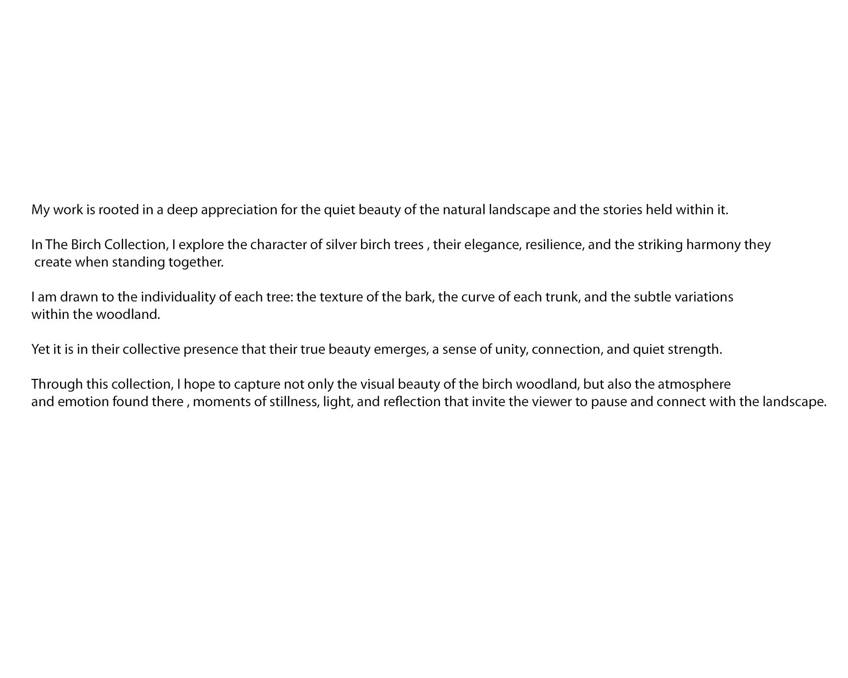 This collection celebrates the singular beauty and character of silver birch trees: their luminous bark, graceful forms, and the sense of connection they create within the landscape. Each image captures both the individuality of the tree and the harmony of the woodland, revealing the understated elegance that makes the birch so enduringly captivating.